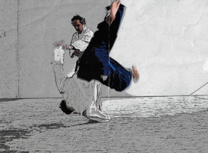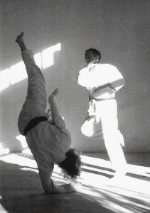 Wie der Kurs hieß. Hatte Harry nicht verstehen können, denn hinter der Wand, die den Empfangs- vom Übungsraum trennte, hatten ohrenbetäubende Fallübungen begonnen. „Da hinten kannst du zuschauen. Sieht zwar so aus, ist aber keine Selbstverteidigung im herkömmlichen Sinn. (…)“ Hrry trat an die bruchsichere Scheibe. Etwa zwanzig Männer und Frauen rannten durch den Raum und sprangen alle paar Meter so hoch, wie sie konnten, drehten sich in der Luft und landeten dann krachend mit einer Körperseite flach auf dem gepolsterten Schwingboden. Dass es sich um Fortgeschrittene handelte, bewies die Eleganz, mit der diese Leute nach dem harten Aufkommen wieder in den Stand federten. Nach der Fallschule fingen die Schwarzgurtprüfungen an. Harry musste ein wenig lächeln, als er die tänzerischen Bewegungen der Sportler beobachtete. Um Judo jedenfalls handelte es sich nicht, um Karate ebenso wenig. Es war etwas, das Harry noch nie gesehen hatte, und wenn er es mit dem harten Training seiner Judo-Zeit verglich, kamen ihm Zweifel, ob es sich überhaupt um einen Kampfsport handelte. Andererseits bedurften die Würfe offenbar einer enormen Schnelligkeit und eines perfekten Timings, so dass er lange aufmerksam und fasziniert zuschaute. Immer wieder bemerkte er Handhebel, die im Judo als zu gefährlich galten und daher verboten waren.